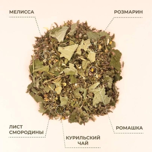 Состав: курильский чай, лист чёрной смородины, мелисса, розмарин, ромашка