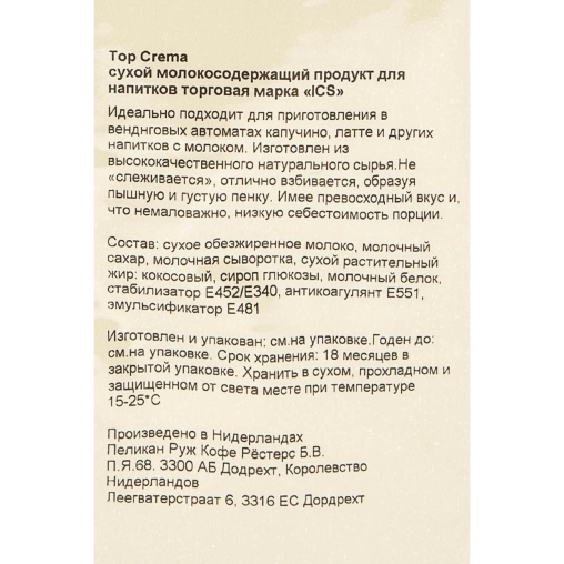 Сухие вендинговые сливки-топпинг с молочной пенкой от ИЦС (Нидерланды) Идеально подходит для приготовления в вендинговых автоматах капучино, латте и других напитков с молоком. Изготовлен из высококачественного натурального сырья. Не "слеживается", отлично взбивается, образуя пышную и густую пенку. Имеет превосходный вкус и, что немаловажно, низкую себестоимость порции.