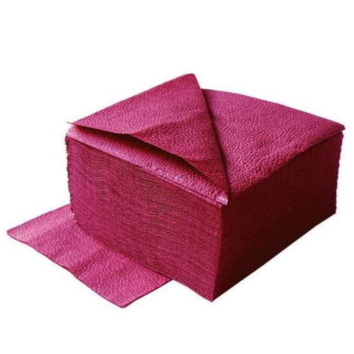 Салфетки 1-слойные бумажные «Complement» в профессиональной упаковке big-pack, в пленке, 400 листов в пачке, в двух стопках. Салфетки с рельефным тиснением по всей поверхности листа, цвет бордовый однотонный, без рисунка. Сырьё – 100% целлюлоза. размер листа 24х24 см. В пачке листы сложены вчетверо, плотно друг к другу.