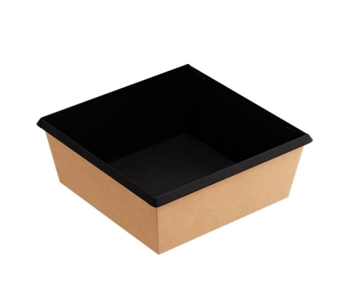 OneClick: неповторимый уникальный, не имеющий аналогов дизайн упаковки со сформированным бортом сделает ваш продукт особенным и легко выделит среди конкурентов. Квадратный картонный контейнер-поддон произведен из высококачественного плотного картона, имеет снаружи крафтовую расцветку без вкраплений макулатуры и черную матовую поверхность внутри. Подходит для: горячего (до 70°С), холодного, замороженного, жирного, продуктов с жидкими составляющими и др.