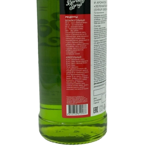 РЕКОМЕНДАЦИИ: Рекомендуется добавлять в алкогольные и безалкогольные напитки, мороженое, десерты, либо разбавлять водой в соотношении 1:5 для придания приятного вкуса, цвета и аромата. Сироп Баринофф Зеленый банан ароматное сладкое лакомство, которое способно сообщить свежие экзотические акценты любимым блюдам и напиткам. Сироп ярко-зеленого цвета отличается соблазнительным ароматом тропических фруктов и многогранным вкусом экзотического зеленого банана. Сироп Зеленый банан служит необходимым компонентом как для алкогольных, так и безалкогольных коктейлей. Этот густой и тягучий сироп преобразует до неузнаваемости обычный лимонад, кофе или холодный чай, а также компоты и газировку.